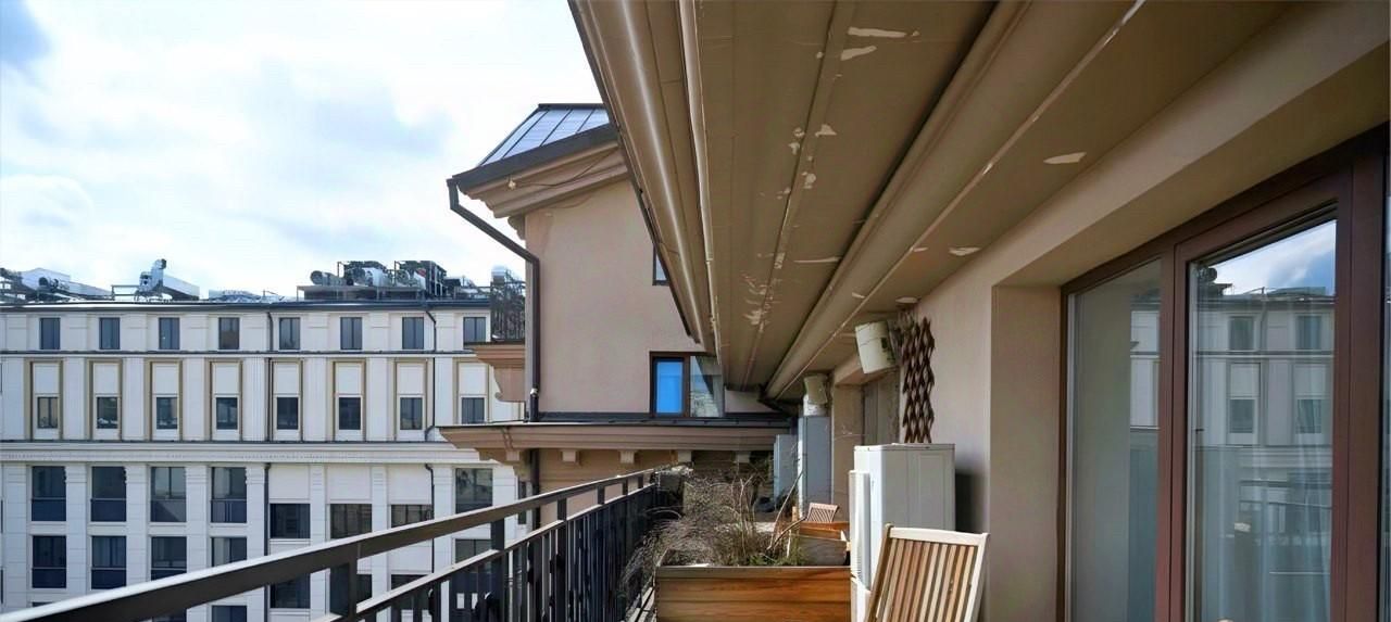Из спальни — прямой выход на террасу на 8-м этаже с видом на тихий, зелёный спокойный двор и ощущением полной приватности.