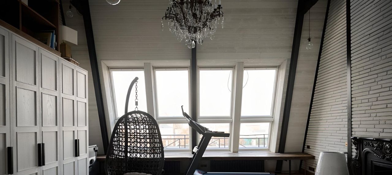 4-й уровень (10-й, последний этаж) — две спальни под скатами крыши и отдельная библиотека, создающая атмосферу приватного чердака для чтения, спрятанного над городом.