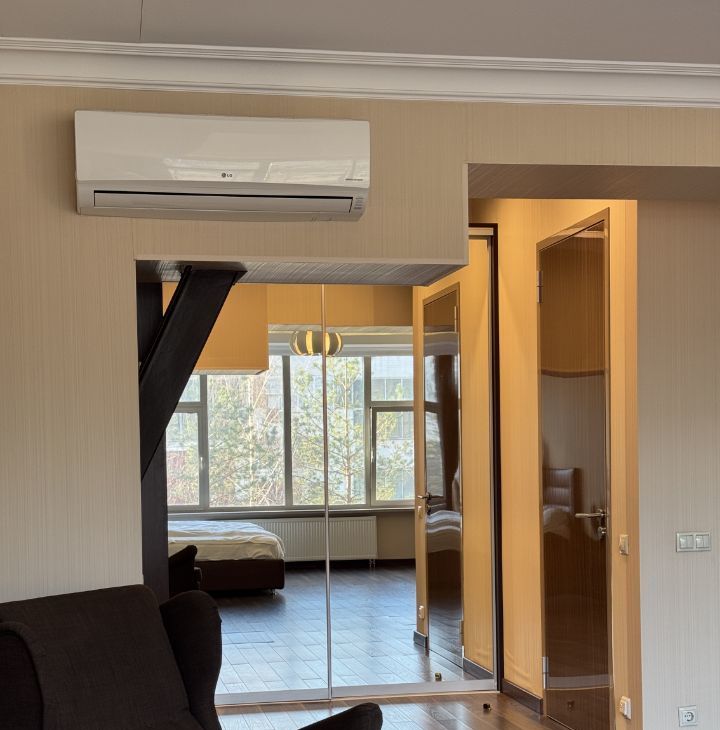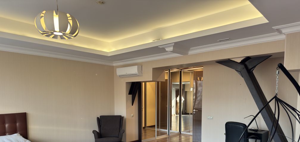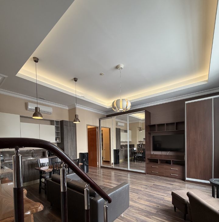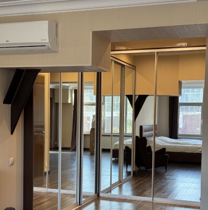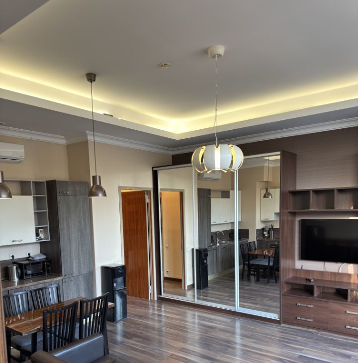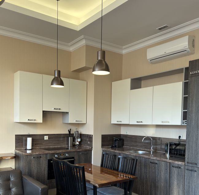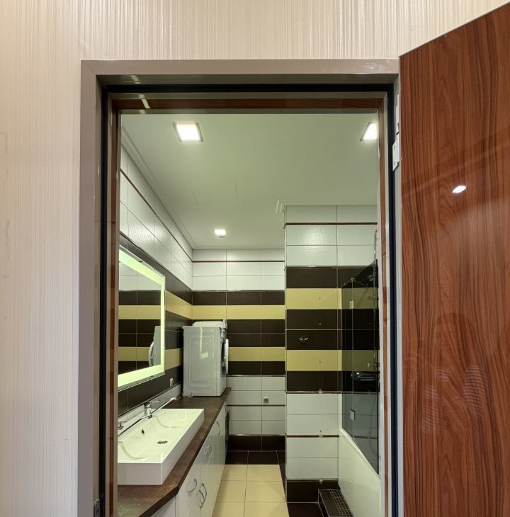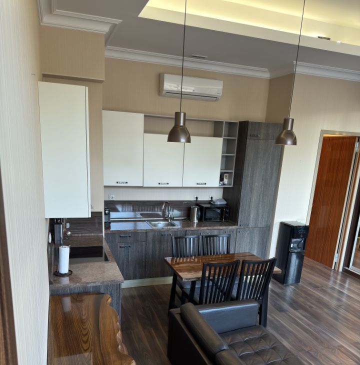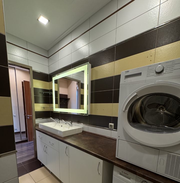 В апартаментах выполнен дизайнерский ремонт, создающий стильную и уютную атмосферу. В наличии вся необходимая мебель как на кухне, так и в жилой зоне. Техника включает кондиционер, холодильник, посудомоечную и стиральную машины, сушилку для белья, а также телевизор. Два совмещённых санузла оборудованы ванной и душевой кабиной, что добавляет удобства в повседневную жизнь.