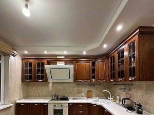 Большая кухня с отдельной обеденной зоной (20.5 кв.м). ТВ зона с раскладным диваном на 2 спальных места для гостей и телевизором с диагональю 55. Обеденный стол раскладывается.