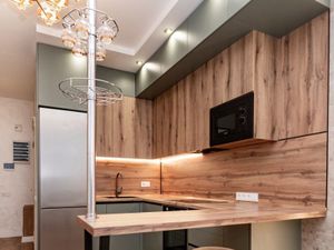 Квартира оформлена по индивидуальному дизайнерскому проекту и полностью готова к проживанию. Здесь есть все необходимое: современная мебель на кухне и в комнатах, кондиционер, холодильник, посудомоечная и стиральная и сушильная машинка. В квартире два совмещенных санузла, оборудованных ванной и душевой кабиной, что удобно для большой семьи или компании.