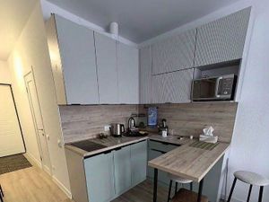 Светлая, уютная студия с авторским ремонтом. Деревянные полы, просторные деревянные подоконники, качественная сантехника (Villeroy & Boch, Grohe), кондиционер, гардеробная с зеркалом во всю стену.